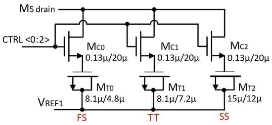 In the temperature range selected for this circuit, since the temperature coefficient deterioration at high temperatures is the main cause of high TC at FF and SF corners, the proposed leakage current compensation technique is not fully applicable. Realizing this, we make the TC of the circuit at the FF and SF corners optimal by setting and resizing transistors and in the active load. Contrarily, the sharp deterioration of TC at a low temperature of −10 °C in the FS, TT, and SS corners is the cause of the high TC. Therefore, the appropriate compensated gate leakage current for FS, TT, and SS corners is adjusted by three-bit trimming so that at low temperatures is realized to enhance temperature compensation. Thus, the circuit is guaranteed to have the smallest possible TC at all process corners.