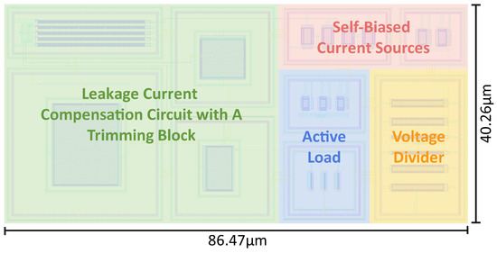 To verify the performance of the proposed voltage reference, a series of post-simulations have been implemented in a standard 65 nm process. The device parameters of the circuit are listed in Table 1, and its layout is shown in Figure 8, with an area of 3481.28 μm2 (86.47 μm × 40.26 μm).