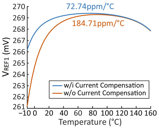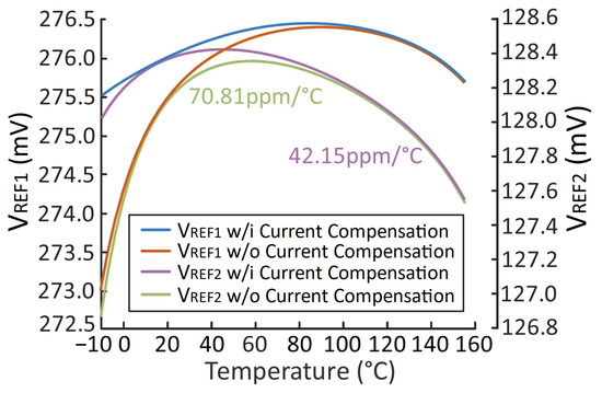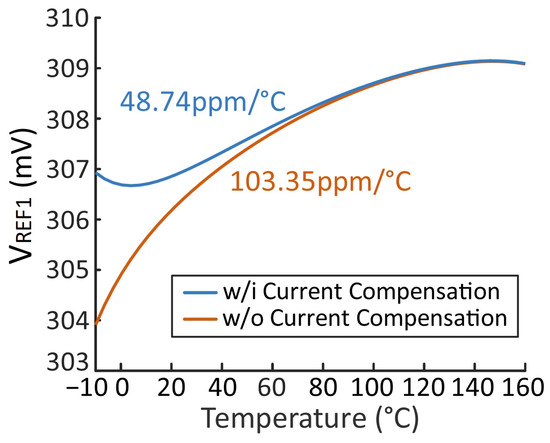 Figure 9 shows the TCs of and at the TT process corner with and without the leakage current compensation. The results illustrate that the leakage current compensation technology proposed in this paper can effectively improve the TC of from 74.59 ppm/°C to 20.40 ppm/°C and the TC of from 70.81 ppm/°C to 42.15 ppm/°C after trimming, respectively. According to the figure, it has also been clearly demonstrated that the implemented leakage current compensation technique primarily enhances temperature compensation at low temperatures.