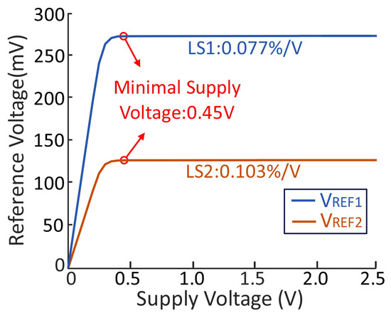 Figure 12 shows the fluctuation of and with the variation in supply voltage, where their LS are 0.077%/V and 0.103%/V, respectively. Moreover, the minimum supply voltage for the entire circuit is 0.45 V.