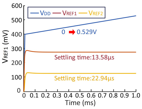 Figure 13 shows the start-up waveform of the circuit, which can start on its own due to the effect of leakage current biasing. The settling times of and at the TT process corner are 13.58 s and 22.94 s, respectively. Therefore, it has better startup performance.