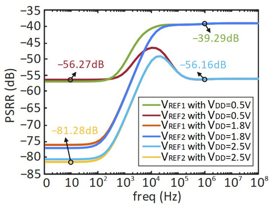 - Yue, H.; Sun, X.; Liu, J.; Xu, W.; Li, H.; Wei, B.; Wang, T.; Lin, S. 16.8/15.2 ppm/°C 81 nW High PSRR Dual-Output Voltage Reference for Portable Biomedical Application. Electronics 2019, 8, 213. [Google Scholar] [CrossRef]