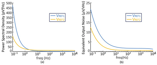 Thermal noise constitutes a major noise source in this circuit due to the large channel resistance of MOS transistors biased in the subthreshold region. Moreover, the 1/f noise is also the dominant noise contribution for , attributable to the use of small-size MOS transistors . Figure 16 depicts the simulated power spectral density and output noise of two output voltages without any additional load capacitance. The integrated noises of and from 0.1 Hz to 100 Hz are 22.65 V and 35.50 V, respectively.