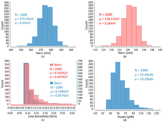 Figure 17c shows that the average LSs of and are 0.103%/V and 0.144%/V, respectively, and each of their are 45.63% and 39.58%. As shown in Figure 17d, the Monte Carlo simulation result of total power is 55.64 pW at room temperature, and its is 34.67%.