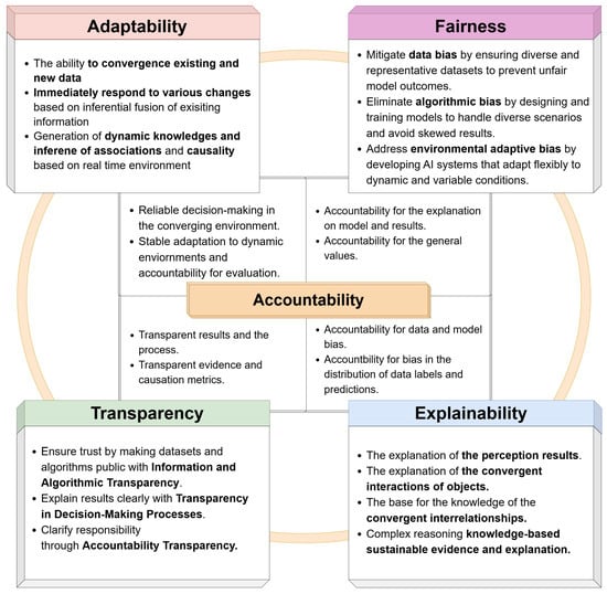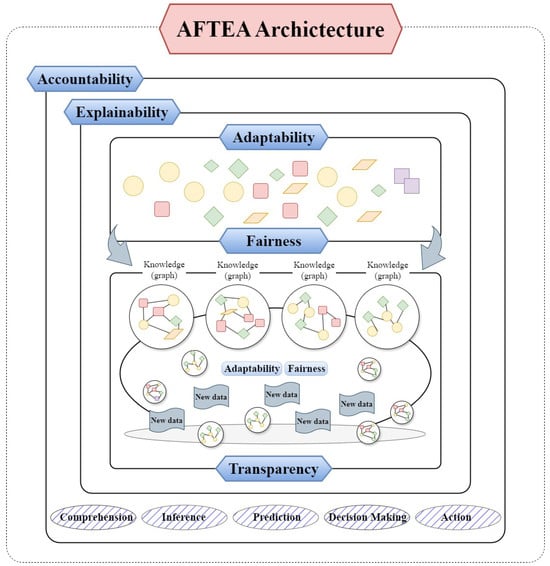 Figure 1 is an architecture that highlights the inclusiveness of the five elements and illustrates how they are important in the process of implementing AI. The shapes represented within “Adaptability” and “Fairness” represent data collected in the real world and are the most important factors to consider in order to be fair and adaptable to the environment and situation context. In addition, as shown in the “Transparency” part of Figure 1, adaptability and fairness must be applied at the same time to ensure trustworthiness in the process of convergence of knowledge and the new data to the knowledge that flexibly represents the dynamic real world. Accountability encompasses all elements, and AFTEA demonstrates that by ensuring responsibility in each applied element, it is possible to achieve reliable outcomes in comprehension, inference, prediction, decision-making, and action execution.