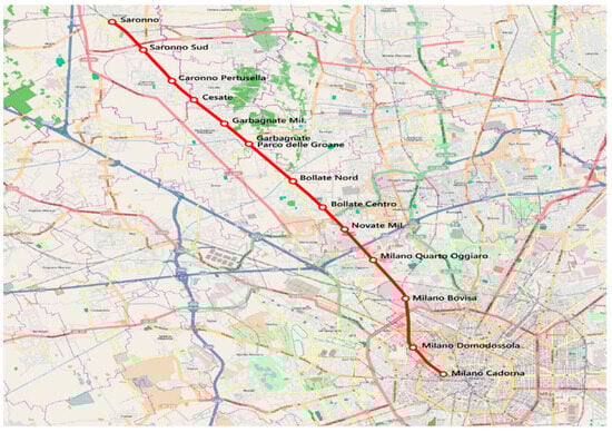 Case study details of the train and route. (a) Aerial photo of the train from Cadorna to Saronno. (b) Train TSR EB 711.