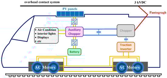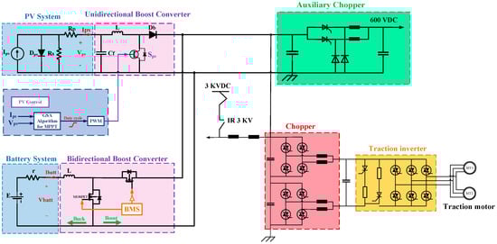 Figure 3 shows the schematic of the electric train supplied by a 3 kV DC traction system implemented with rooftop PV panels, which includes a small battery energy storage system and a bidirectional converter. The configuration, as described in reference [7], includes several components, including PV panels, a DC–DC converter with the MPPT method, a bidirectional DC–DC converter, a battery management system (BMS), a grid-connected converter, a grid-connected controller, and an energy management system. Figure 4 displays the inside circuitry of the proposed system.