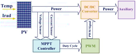 Figure 5 displays the block diagram of the solar panel installed on the train’s roof to supply the auxiliary system and the MPPT controller. The output voltage and current of the PV panel are measured using voltage and current sensors and are the inputs of the MPPT. The suggested MPPT algorithm produces a duty cycle signal that is compared with a triangular waveform to create the control signal for the IGBT switch of the boost converter (pulse width modulation (PWM)).