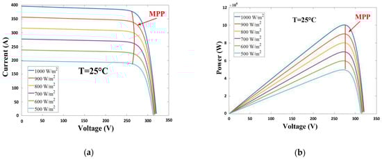 Maximum power (MP) is generated by running rooftop solar panels at the maximum voltage for photovoltaic systems. This point is usually observed on the knee of the solar panel’s I-V graph. As a result, the solar panel’s maximum output power may be achieved at a single operating point. This dot on the curve of P-V is referred to as the MPP. Figure 6 depicts the P-V and I-V characteristic curves of the PV cell [34]. These curves indicate that the PV system must operate at specific current and voltage values to achieve MPP. The location of the MPP varies with operational conditions (temperature and irradiance); hence, an MPP tracking system is needed to ensure that we reach as close to the MPP as feasible. The MPP point on the I-V and P-V graphs of the solar cells continuously shifts as the irradiance changes, as seen in Figure 7.