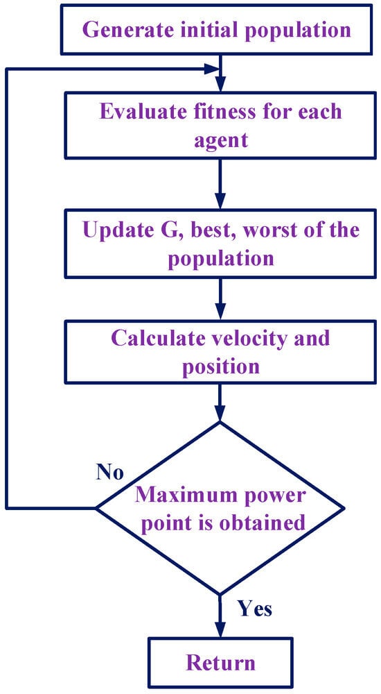 The GSA uses Newton’s law of gravitation to determine the best solution to optimization problems. In this method, different solutions are considered as particles moving in the search space. Particles with greater mass represent better solutions and attract particles with lower mass. Finally, all particles converge to the particle with the highest mass, representing the optimal solution to the optimization problem [24]. In this section, Figure 8 shows the flow diagram of the GSA. We must assume here that there is a population of size ‘m’, and the location of agent ‘i’ (solar voltage) is given by Equation (5).