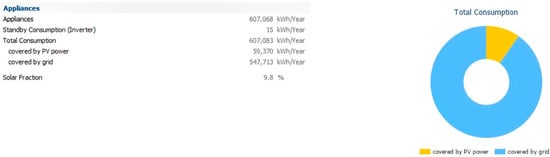 Auxiliary power supply systems convert electricity for interior lighting, displays, air conditioning, and other applications. The yearly energy usage for a train on the considered line is estimated to be around 607 MWh. As mentioned earlier, in this section, the issue of auxiliary energy consumption of the train is discussed. The yearly energy consumption for the postulated case study is adopted based on Equation (17), which is as follows: