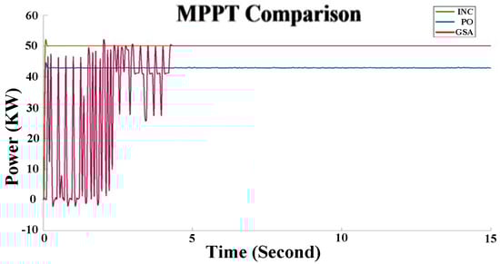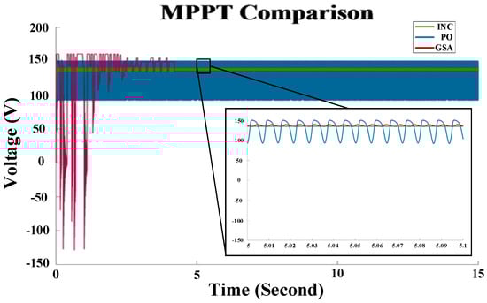 The GSA optimizes the output voltage of PV systems to allow for optimal power extraction from solar modules. This algorithm’s best performance is determined by the precise setting of its parameters (Table 3). Evaluating the performance of MPPT with the GSA, PO, and INC algorithms shows that MPPT with the GSA can optimize the solar cell output power more accurately and consistently. After several iterations, the algorithm converges to the optimal voltage and power values of approximately 150 V and 50 KW, respectively. Figure 14 indicates that the INC and PO algorithms have a faster convergence speed than the GSA and estimate the output power with 100% and 90% accuracy, respectively; however, there are fluctuations in the output voltage. In contrast, the GSA, despite its longer convergence time, exhibits more stable performance due to the absence of oscillations in the output voltage. Figure 15 shows the performance of MPPT algorithms based on GSA, PO, and INC on the voltage curve of a PV panel.