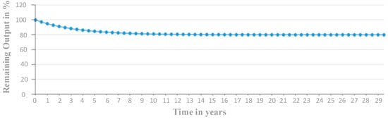 To assess the long-term performance of the PV system, the degradation rate of modules must be taken into account. As demonstrated in Figure 16, the output power of PV panels will be 97% after one year and 85% after 20 years, respectively. Taking these into consideration, a typical lifetime of 20 to 25 years can be used in economic research.