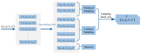 An experience replay buffer D2 is inserted beneath the original experience replay buffer D1 to attempt to fix the problem mentioned above. The reward values of the stored initial samples are sorted in descending order in experience replay buffer D2, as seen in Figure 5. After removing lower-reward data from the bottom of the experience replay buffer, a specific percentage of the remaining data are sampled using both priority sampling and uniform sampling.