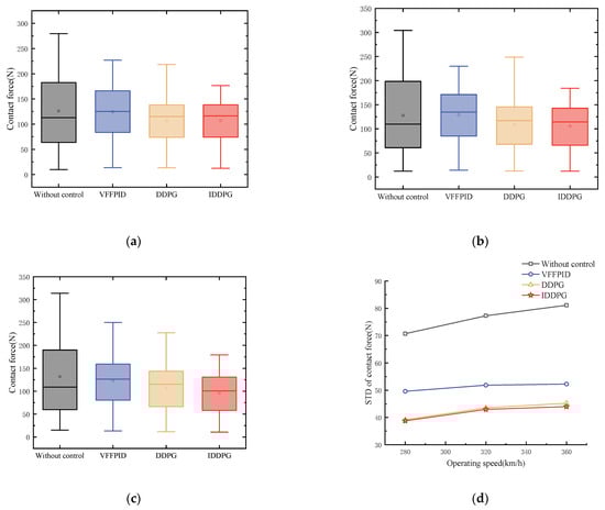 By measuring the level of dispersion, the standard deviation provides an explanation for the magnitude of PCCF fluctuations. The standard deviation of PCCF under different control strategies and operating speeds is shown in Figure 11d. At 280 km/h, 320 km/h, and 360 km/h, the standard deviation of PCCF is reduced by 53.06%, 55.46%, and 53.11%, respectively. The experimental results show that IDPPG control can effectively suppress the fluctuation of PCCF compared with other control methods. More detailed contact force data for different control methods are shown in Appendix A, Table A2.