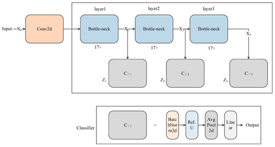 The tiering strategy is as follows: Firstly, the parameters of the first convolution layer are frozen (this layer does not participate in updates in all subsequent training steps; this is because the first layer is usually close to the data and can make better use of the low-level features of the pre-trained data). Secondly, the three bottleneck stages are divided into one layer each. Lastly, each layer is followed by an auxiliary classifier to output the prediction results for the current layer.