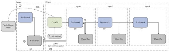 ①–② Server public knowledge learning: The original model uses the public dataset to learn, train, converge, and construct a pre-training model based on this dataset. Therefore, during initialization, the server selects a pre-trained model of public data which has a similar distribution to private data.
