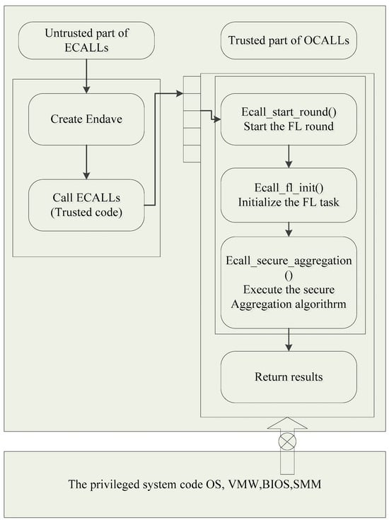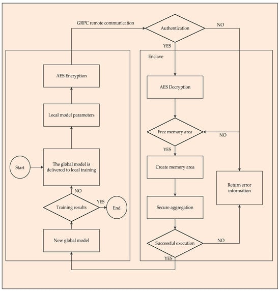 Intel’s SGX technology plays a vital role in this study. It constructs a hardware-level secure enclave, namely, an enclave. In this way, even if there is a potential threat to the system software, data and algorithms can maintain their encryption state during the processing and only decrypt in a secure form within the CPU, which significantly alleviates the risk of data leakage and meets the high-standard requirements of federal learning for data privacy. The flow chart of federated learning based on a trusted execution environment is shown in Figure 7.