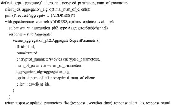The call_grpc_aggregate function is used to initiate aggregation requests to the server and receive multiple parameters, including the federated learning I.D. (fl_id), round, encrypted parameters, total number of parameters, the client I.D. list, the aggregation algorithm identifier, and the optimal number of clients. The function finally returns the updated parameters, execution time, the I.D. list of clients participating in the aggregation, and the current round in the server response. The specific code is shown in Figure 5.