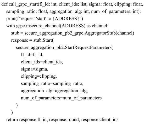 The call_grpc_start function is used to start the secure aggregation process. The accepted parameters include the federated learning I.D., client I.D. list, noise standard deviation (sigma), gradient clipping threshold (clipping), sampling ratio, aggregation algorithm identification, and number of parameters. The function finally returns the list of federated learning I.D.s, rounds, and participating client I.D.s in the server response, indicating the success of the startup request and its details. The specific code is shown in Figure 6.