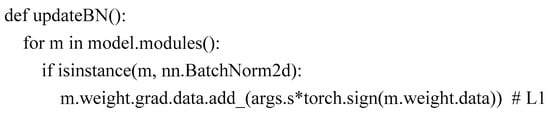 The steps are detailed as follows: First, the scaling factor is introduced. A scaling factor is introduced into each channel of the convolutional layer, which can reuse the scaling parameter (γ) of the Batch Normalization (B.N.) layer. In this way, the introduction of new parameters can be avoided, and the importance of the channel can be effectively measured. Secondly, sparse regularization is introduced in the training process. During the training process, sparse regularization is applied to these scaling factors. Specifically, by adding an L1 regularization term to the loss function to push the scaling factor to zero, the corresponding channel becomes unimportant. The training objective function is as follows:
