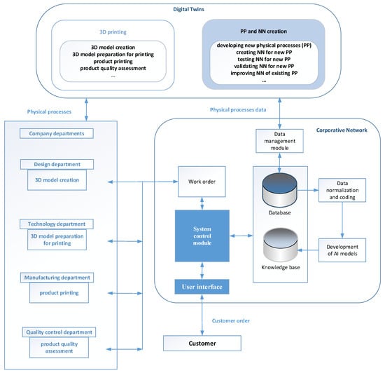 The architecture of our artificial intelligence-based DT system using 3D printing processes as an example is described in Figure 3. It provides a dynamic virtual representation of a physical object/process at selected stages of its lifecycle. Our DT system covers these selected physical processes: 3D model creation, 3D model preparation for printing, product printing, and product quality assessment. In the databases, for product printing, we have descriptions of these physical processes (e.g., production type, material type, layer height, coating thickness, bottom thickness, top thickness, fill density, print speed, bed temperature, print temperature, second nozzle temperature, build orientation, number of contours, and tensile strength). The systems can both provide observations on the current state of the system and answer “what if” questions. Multiple neural networks have been defined for each decision problem at the product printing stage and their specific tasks. In the knowledge base, we have descriptions in the form of NN models. When an order comes in from a customer, the control module distributes the tasks to the different departments of the company. The order is processed. New physical processes are the basis for expanding the data and knowledge in the system. In this way, the system learns continuously, and knowledge is accumulated as the system runs [34].