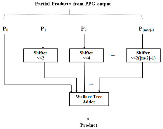 The radix-4 partial products are obtained using shifters and adders, and the Wallace tree adder is used to carry out addition. The architecture for computing radix-4 computation wherein the product is obtained using some part of the multiplier and some part of the multiplicand is given in Figure 2.