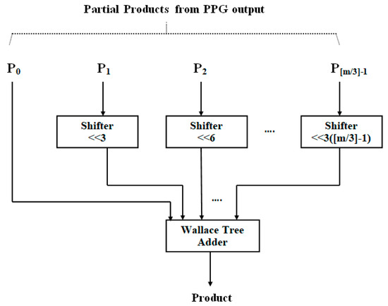 where represents the jth lower part of the important bit of and the width of a number is indicated as n. is specified as an integer, and it is converted into a fixed-point representation by appropriate shift operation. The four bits are combined by utilizing the radix-8 Booth concealing formulary, which is depicted in Table 1.