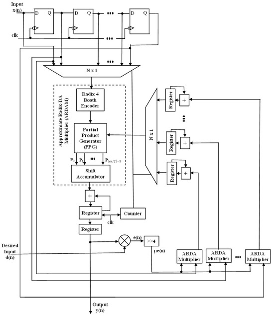 - Allred, D.; Yoo, H.; Krishnan, V.; Huang, W.; Anderson, D.V. LMS adaptive filters using distributed arithmetic for high throughput. IEEE Trans. Circuits Syst. I Regul. Pap. 2005, 52, 1327–1337. [Google Scholar] [CrossRef]