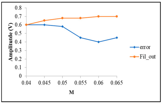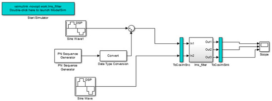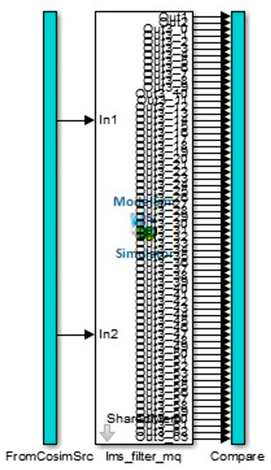 The Simulink module and the FIL block of the devised structure are given in Figure 6 and Figure 7. The filter output is plotted for several step index components (M = µ) and is illustrated in Figure 8. It is understood that the error is less for the M = µ = 0.6. Therefore, in the proposed adaptive architecture, µ = 0.6 is considered.