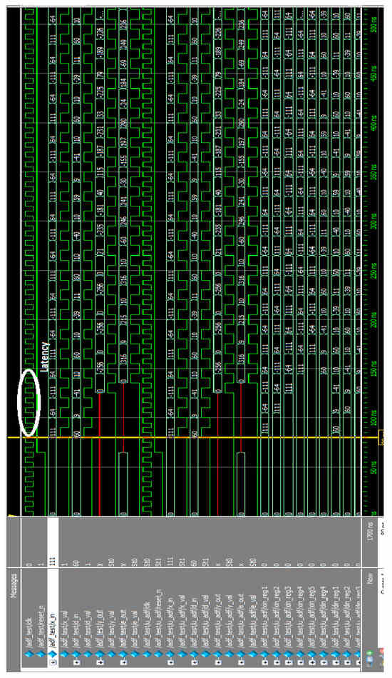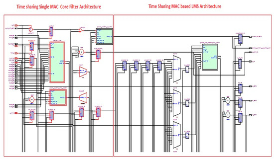 The simulated result of the devised architecture is shown in Figure 9. After six clock cycles, the output is attained at 125 ns wherein the input is given at 80 ns. Figure 10 depicts the RTL view of the suggested architecture. It is observed that the investigated filter overview shows the two major blocks, namely the time-sharing single-MAC unit and LMS unit. The ARDAM unit is essentially utilized in these designs to build optimized structures. Table 2 lists the complexity of designing the architecture in terms of multiplication and registers. Six clock cycles are needed for the filter structure’s delay. It takes four clock cycles for the MAC to operate; two clock cycles are needed for input registration, one clock cycle for multiply and one for the accumulate process. The output must be registered and the coefficients must be updated during the remaining two clock cycles. For this architecture, N + 6 registers are needed overall, where N is the number of taps. No matter how many filter taps there are, a single-MAC is sufficient for filter operation because of the dedicated multiplier structure. Table 3 makes it clear that, with regard to the number of taps, the time-sharing scheme that is being suggested has a hardware complexity that only requires two multipliers. The suggested architecture has a faster convergence rate and reduced complexity, according to the implementation findings.
