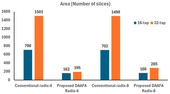 The proposed DAAFA radix-4 and radix-8 architectures are also compared with the existing work in terms of logic elements, as outlined in Table 6. From Table 6, it is inferred that the proposed 16-tap radix-8 architecture offers area optimization of about 50.73%, 29.51% and 19.17% over the existing design (k = 2, 4 and 8) [21]. Furthermore, an area reduction of about 51.87%, 31.15% and 21.05%, respectively, is obtained for the proposed 16-tap radix-4 DAAFA compared to the conventional approach (k = 2, 4 and 8) [21]. In addition, the area minimization for the proposed 32-tap radix-8 DAAFA design achieves reductions of 55.53%, 30.16% and 6.99% compared to the conventional design. Similarly, the area reduction of the investigated 32-tap radix-4 DAAFA structure avails 56.11%, 31.07% and 8.2%, respectively, compared to the already reported design [21]. Therefore, the approximation-based proposed architecture utilizes a single-MAC core that provides a more efficient realization compared to the existing realization.