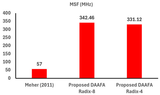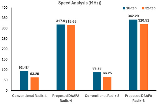 The propounded architecture is implemented using Xilinx and the Altera platform. Considering Xilinx Virtex-5 FPGA, the maximum sampling frequency that can be achieved relies on various factors, which include the specific model, application type, architecture and resources utilized. The Virtex-5 series features DSP48E slices, which can operate at clock frequencies of up to 550 MHz. This indicates that the theoretical maximum sampling frequency for a single-stage operation using these DSP slices could be around 550 MHz. Also, the clock management tile input frequency is about 500 MHz. Likewise, for high-speed serial input–output operation supports a frequency of about 1.25 GHz. The maximum frequency is determined by estimating the routing delay and the number of logic levels separating the registers. More than 300 MHz can be clocked using the suggested design, which has minimal logic levels between registers. Hence, the proposed DAAFA realization achieves a maximum sampling frequency greater than 300 MHz.