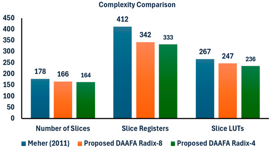 Table 7, Table 8 and Table 9 compare the synthesis summary of the proposed DAAFA architecture with several other extant filter structures, and the synthesis and analysis were carried out using various Xilinx FPGA devices. The proposed DAAFA architectures achieved drastic area reduction and greater speed improvement compared to the preset structures. From Table 7, it is noticeable that the proposed radix-8 design achieves area minimization of about 66.61% and 91.87% over the existing designs [20,22]. Similarly, the proposed radix-8 design offers area optimization of about 65.82% and 91.69% compared to the prevailing structures [20,22]. Likewise, the speed of the synthesized proposed radix-4 architecture is embellished by 90.99% and 93.81% compared to the existing design [20,22]. In addition, the proposed radix-4 architecture enhances the speed by about 91.13% and 93.91% compared to the prevailing design.