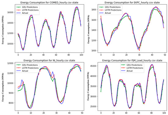 Figure 10 shows that the results of the GRU model are very close to those obtained by the LSTM model, with only slight changes in the MSE and MAPE. We obtained these results by applying the GRU and LSTM on each dataset. This shows that both models can handle dynamic load forecasting tasks, and selecting one over the other may depend on needs and computing limitations.