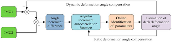 To achieve a high-precision dynamic deformation model, a dynamic deflection deformation model parameter identification method based on the difference in angular increment is proposed, in which an optimization model was constructed based on the autocorrelation function of the angle increment difference between two sets of IMUs, and the related vector machine algorithm was applied for online parameter estimation. Finally, the estimated dynamic deflection parameters were applied to the filtering model based on inertia matching to estimate the deformation angle. The online identification process of dynamic deformation model parameters is shown in Figure 2.