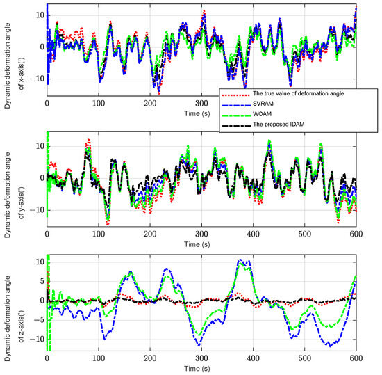 It can be concluded from Figure 4 that the proposed algorithm can track and estimate the dynamic deformation angle more effectively compared to the SVRAM and WOAM methods, especially for the estimation of the z-axis dynamic deformation angle. Furthermore, as shown in Figure 5 and Figure 6, the proposed IDAM method significantly improves the accuracy of deck attitude measurement with accurate estimation of dynamic deformation angles and effective implementation of model prediction filtering. For the z-axis attitude, the estimated RMSE of the IDAM was 4.260′. Compared with the 6.560′ and 5.032′ of SVRAM and WOAM methods, respectively. Thus, the estimation accuracy decreased by 35.06% and 15.34%, respectively, indicating that the proposed algorithm can effectively improve the attitude measurement accuracy under deck dynamic deformation.