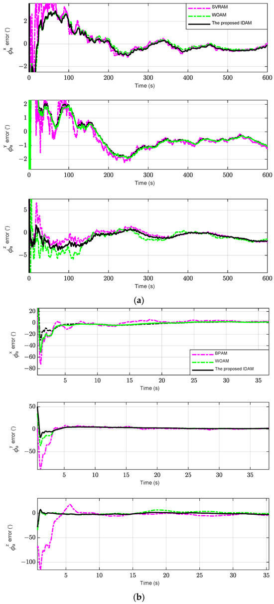 The error of attitude error angle estimation with different methods; (a) overall view of attitude error angle estimation; (b) partial enlarged drawing of attitude error angle estimation.