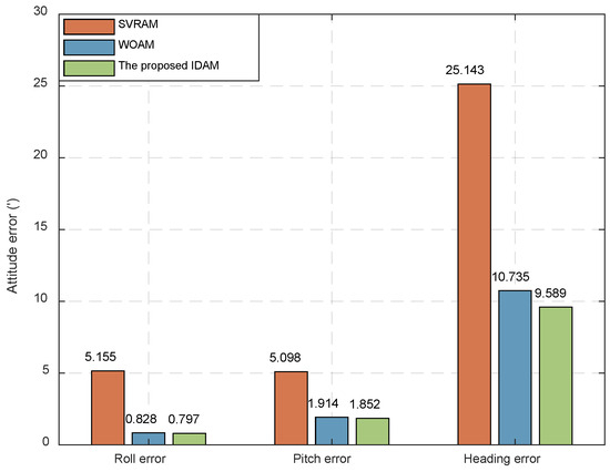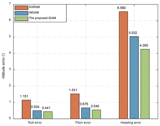 From Figure 9, the following conclusions can be drawn: (1) Compared with the SVRAM method, the attitude errors of the WOAM and proposed IDAM methods were significantly reduced; (2) in terms of horizontal attitude error, the difference between the WOAM methods and the proposed IDAM methods was minimal; (3) in terms of heading error, the WOAM method had a large error, around 150 s, and the proposed IDAM method had better performance. Finally, the obtained conclusions are consistent with the simulation results.