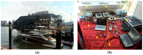 To further verify the effectiveness and reliability of the proposed method, a shipborne experiment was conducted. Figure 7a shows the overall view of the shipborne experiment platform. All experimental equipment is annotated in Figure 7b including the high-precision fiber optic inertial navigation system (PHINS), the main IMU, the sub-IMU and so on. PHINS, the main IMU, and sub-IMU were connected with the synchronous recording device and data record computer to synchronously record all navigation information.