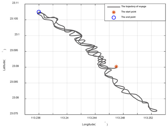 - The initial latitude was set to 45° and the initial longitude was set to 126°. The motion state of the ship was to move forward with a constant speed of 20 knots. The initial roll angle was 0°, the initial pitch angle was also 0°, and the initial heading angle was 45°. The ship’s sway motion satisfies Equation (79)