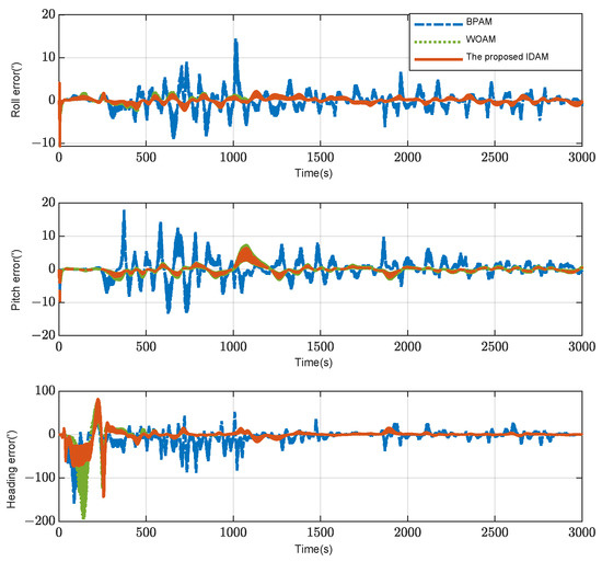 Figure 9 gives the attitude error of the deck under different methods, and its RMSE is shown in Figure 10.