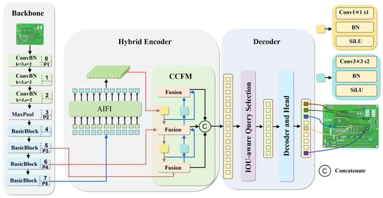 In recent years, deep learning networks play a vital role in improving the performance of PCB defect detection, due to their powerful learning capability and strong feature representation ability on relatively large datasets. Generally, the prevalent Convolutional Neural Network (CNN) architectures exhibit high accuracy and good generalization capability on defect representation. Concretely, Park et al. addressed the issue of CNN performance degradation caused by a small training image dataset, named MarsNet [], which enhances the resolution of feature maps through improvements in the dilated residual network (DRN) []. Wu utilized the Mask RCNN [] for effective classification and localization of solder joint defects, achieving promising results. Ross B. Girshick et al. introduced the Fast R-CNN [] with a multitask learning strategy, sharing feature layers during training to promote model generalization and detection speed. Ding et al. presented TDD-Net [], which builds upon Faster RCNN [] by integrating Res-Net and feature pyramid networks (FPN) for multi-scale anchor-based detection of small defects on PCBs, demonstrating robustness and generalization of performance. Hu et al. updated Faster RCNN with GARPN [] and ShuffleNetV2 [] units to improve detection speed and mAP. Li et al. extended the FPN model through semantic fusion across high and low-level layers and introduced a focal loss function [] to further boost detection performance. Although transformer models [], proposed by Vaswani et al., show limited performance in end-to-end object detection due to high computational costs and challenges in achieving high accuracy for small object detection, the parallel execution of the transformer model with ResNet to optimize detection of small targets has broad applicability, but may introduce huge computational burdens unsuitable for high-efficiency and real-time industrial applications. YOLO architecture [] achieves fast end-to-end object detection with a simple design, yet its detection accuracy and robustness may decrease in complex backgrounds or dense target scenarios. Notably, RTDETR [], proposed by Zhao et al., performs real-time end-to-end detection based on transformers, effectively handling multi-scale features through internal scale interactions and cross-scale fusion, showing superior performance compared to equivalently scaled YOLO detectors. Based on the good performance of RTDETR on diverse object detection, the main motivation of this work is to explore an efficient yet lightweight deep model based on improved REDETR.