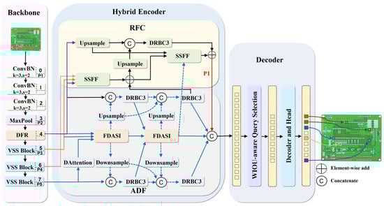 This study aims to construct a lightweight MFAD-RTDETR model, which is shown in Figure 2. The main structure of MFAD-RTDETR, similar to that of RTDETR, also contains three main components: the backbone network, the hybrid encoder, and the decoder. As traditional feature extraction methods are insufficient in handling complex tasks of detecting small defects on PCBs, the proposed MFAD-RTDETR not only effectively improves attention to details but also minimizes network parameters. Briefly, compared with RTDETR, the main improvements of MFAD-RTDETR are the following seven aspects.
