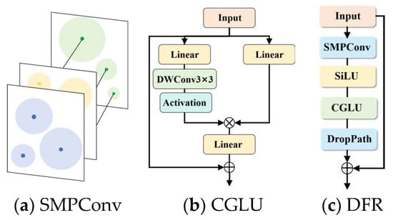 When dealing with the diversity and complexity of data, conventional convolution operators may fail to capture detailed features effectively []. To cope with this problem, we innovatively combine SMPConv and CGLU to develop a DFR module. As shown in Figure 3a,b, this module mainly comprises the Self-Moving Point Convolution (SMPConv) module and the Convolutional GLU module. Concretely, the Self-Moving Point mechanism involves defining the SMP operator as the weighted sum of neighboring points for a query point , influenced by their distance to point . Points beyond a certain distance (depending on the radius) do not affect the query point, enabling the model to capture complex patterns and variations in the data more accurately than the fixed-point representations. Each convolution layer has independently learnable parameters and shares position parameters to create arbitrarily large kernels while reducing the number of learnable parameters, thus achieving precise detail features. And the gating mechanism in CGLU consists of two linear projection stages, one of which is activated by an activation function and then multiplied elementwise. By introducing depth-wise separable convolutions (DWConv), each token gains a gated channel attention based on nearest neighbor features, allowing more flexible selection and retention of local feature details. In addition, the DFR module is designed to accurately locate and extract fine features, enhancing the capability to extract fine-grained features.