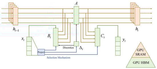 Traditional transformer-based attention mechanisms suffer from high computational complexity and the limitations of fixed global attention. To address this, a VSS block based on the Mamba architecture is introduced, which effectively alleviates these issues. As shown in Figure 4, the Mamba (S6) architecture draws inspiration from the concept of a state machine.