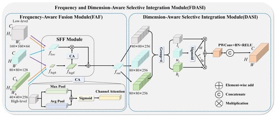 In the original RTDETR, the classic CCFM only fused features at different scales, which easily led to the loss of important details during down-sampling and caused information redundancy due to repeated stackings. To deal with this situation, the Dimension-Aware Selective Integration Module (DASI) [] aims to represent detailed features. However, it preprocesses different scales independently, thus breaking the correlation between different scales. To address this issue, depicted in Figure 6, we alter course to approach it from the perspective of multi-frequency fusion. Natural images encompass a diverse frequency spectrum, with high and low frequencies playing different roles in capturing image features: the former focuses on local details, while the latter captures the global structures. To effectively integrate these features, this work designed the FDASI module. In the preprocessing stage of FDASI, the Frequency-Aware Fusion (FAF) module was developed. This module addresses three different frequency features by dividing them into three groups and inputting them pairwise into the Select Feature Fusion (SFF) module, which includes the Coordinate Attention (CA) module. After a single parallel multi-frequency operation, the features are multiplied elementwise with relatively high-frequency features to obtain fused high-frequency features and then combined with the original low-frequency features. This process results in fused features that contain rich multi-frequency information, providing more comprehensive input features for the subsequent modules. These features are subsequently fed into the DASI module, as described in Equations (1)–(4). In the equations, , , and represent high-dimensional features, low-dimensional features, and the current layer’s features, respectively. represents the selective aggregation result of each partition, denotes the output after channel dimension merging, and represent batch normalization (BN) and the rectified linear unit (RELU), and is the final output. If the output of the activation function , the model gives higher priority to fine-grained features. Otherwise, it emphasizes contextual features. The approach preserves rich multi-frequency information while paying attention to detail features.