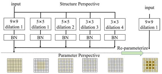 (5) Meanwhile, a receptive field synthesis mechanism has been introduced to employ the Dilated Reparam Block (DRB) []. This approach uses small convolutional kernels during the training phase, which can equivalently transform into nondilated layers with sparse larger kernels during the testing phase, thereby reducing the number of network parameters.