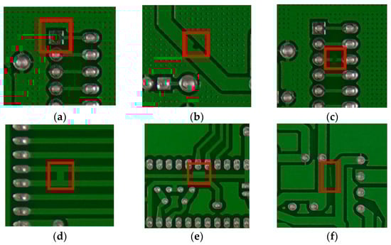 The classic defect images (a) missing hole; (b) mouse bite; (c) open circuit; (d) short circuit; (e) spur; and (f) spurious copper. The red boxes mark the corresponding defects.