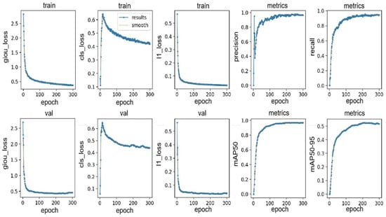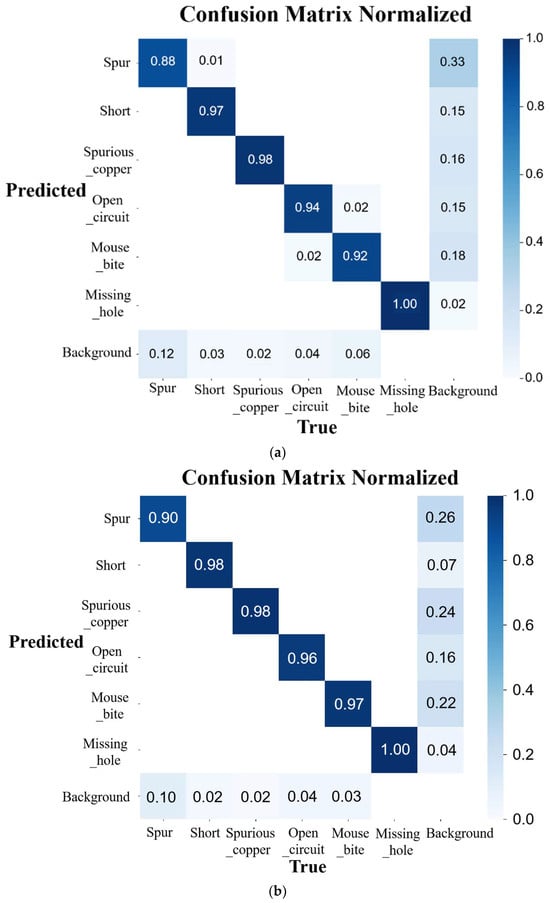 To better prove the robust performance of the MFAD-RTDETR model, we visualized the changes in the loss function during the whole training and validation process of MFAD-RTDETR in Figure 11. From Figure 11, it can be seen the giou_loss curves of training and validation both ultimately converge smoothly to less than 0.5, while the cls_loss curves converge between 0.4 and 0.5. Additionally, the l1_loss curves converge to within 0.1. Furthermore, mAP50 and mAP50-95 eventually stabilize between 0.8 and 1.0, and above 0.5, respectively. In the end, after 300 epochs in the training process, all curves converge smoothly and flat, indicating that the model training results are relatively ideal. To further verify the effectiveness of the proposed model on each defect category, the normalized confusion matrixes of the RT-DETR and MFAD-RTDETR models at their respective optimal performances are shown in Figure 12. The comparative visualization demonstrates that the MFAD-RTDETR model achieves ideal performance, which surpasses the original RT-DETR model across defect categories except for the missing_hole defect. As the detection accuracy for the missing_hole defect reaches 100%, the MFAD-RTDETR model proposed in this paper exhibits excellent performance in detecting small defect targets, thereby confirming its effectiveness and reliability in real-world industry scenarios. Therefore, this advancement indicates significant potential for the application of the MFAD-RTDETR model in detecting small object defects in the industrial field.